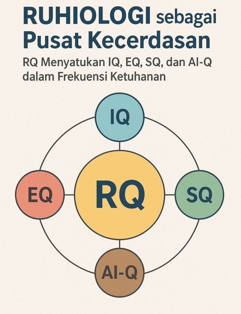 Di sinilah Ruhiologi (RQ) hadir. Ia bukan sekadar pelengkap, melainkan pusat gravitasi yang menggerakkan sekaligus menyatukan seluruh kecerdasan ke satu frekuensi: frekuensi ketuhanan.